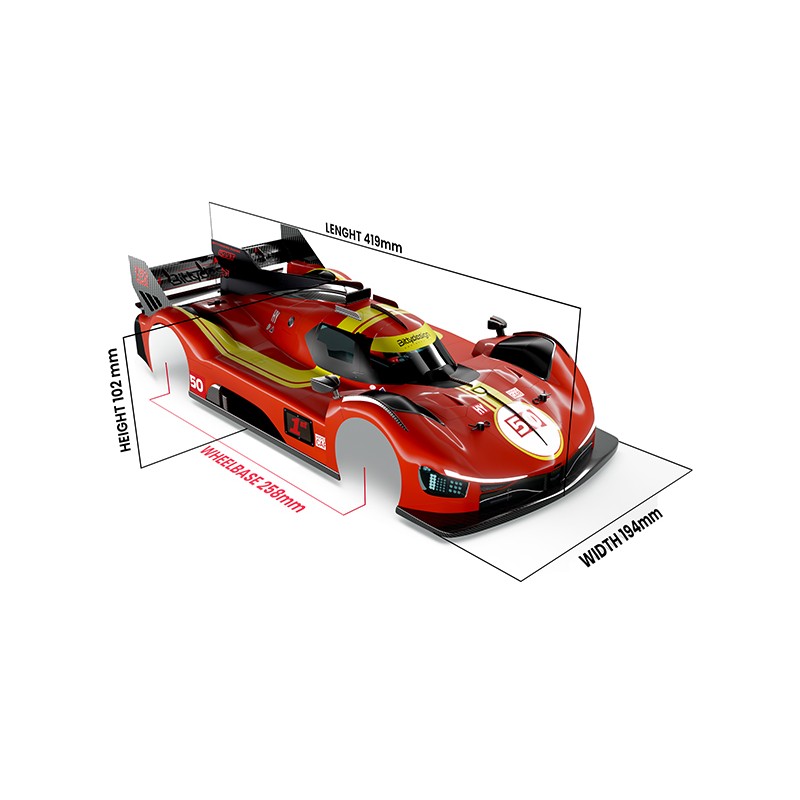 The body has been specially designed for the 1/10 Tamiya TT-02 chassis; the shell also fits any competition touring chassis with raised shock tower profiles.